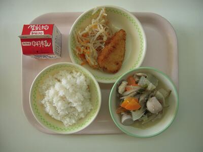 今日の給食献立は、「ぶたじる」「あじフライ」「もやしのナムル」「ご飯」「牛乳」です。