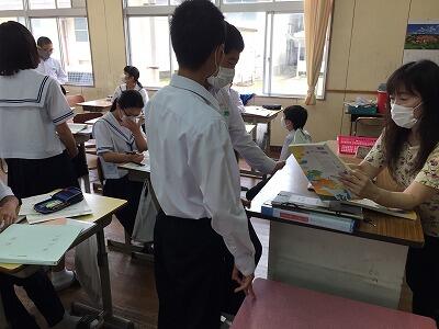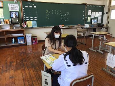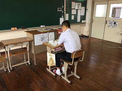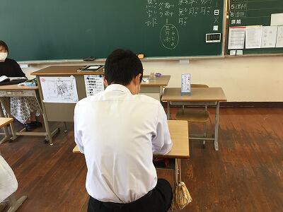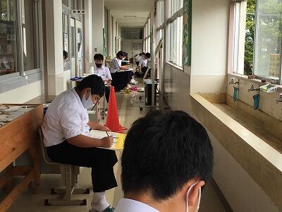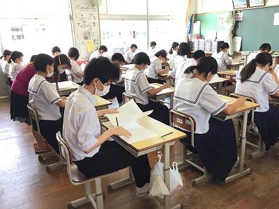 3年の音楽の授業です。図書室で個別に歌のテストをしています。残りの生徒はプリント学習をしています。(昨日)
