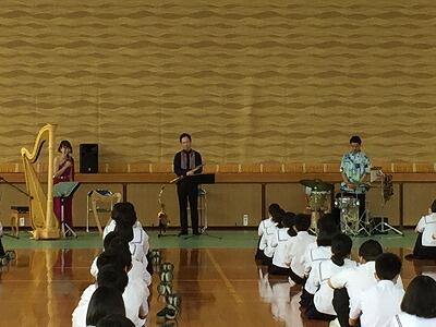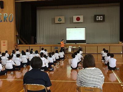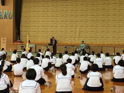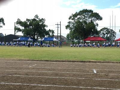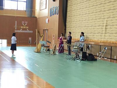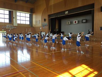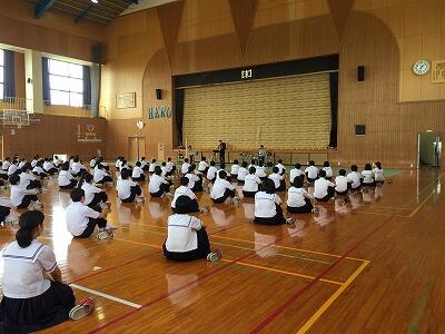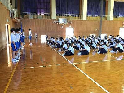 手前が2年生、体育館後ろ側が3年生、向こうに1年生が座っています。
