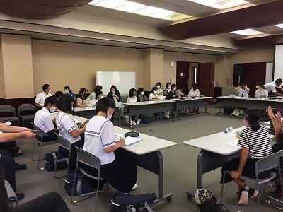 テーマディスカッションの一コマです。各学級ごとの意見を出すために集まって協議しています。