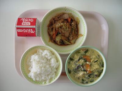 今日の給食献立は、「にらたまスープ」「ホイコーロー」「ご飯」「牛乳」です。