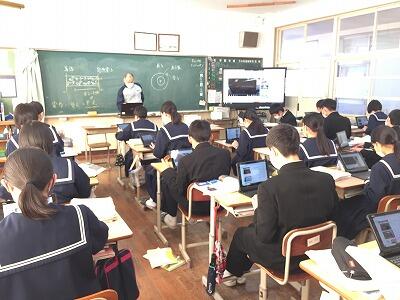 3年生の教室です。事前に撮った部活動紹介の動画を見ています。↓