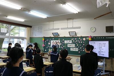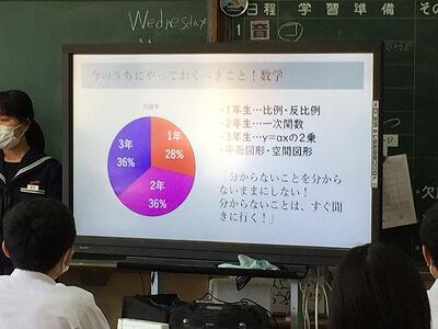 1年生の学級です。生徒会三役の紹介を見ています。↓