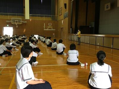 手前が2年生、体育館後ろ側が3年生、向こうに1年生が座っています。