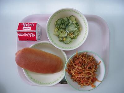 今日の給食献立は、「スパゲティミートソース」「フレンチサラダ」「牛乳」です。