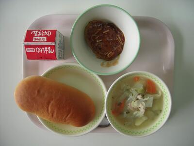 今日の給食献立は、「やさいスープ」「きのこソースハンバーグ」「ミルクパン」「牛乳」です。