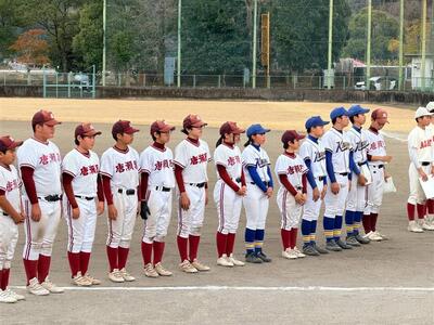 写真にある青いユニフォームは本校野球部員、赤いユニフォームは、唐瀬原中学校野球部員です。嬉しい気持ちが表情にあらわれています。