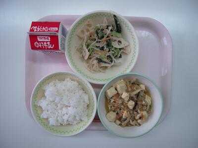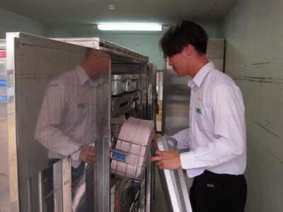給食では、ご飯、牛乳、大きいおかず、小さいおかず、などをお盆にのせています。このお盆は、毎日,学級で保管しています。1週間に1回だけ、回収して消毒します。それが火曜日です。