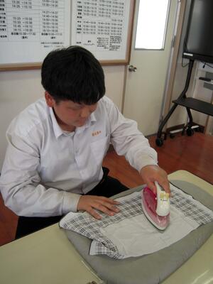 最後は洗って、アイロンかけをします。アイロンの使い方を先生から習っています。