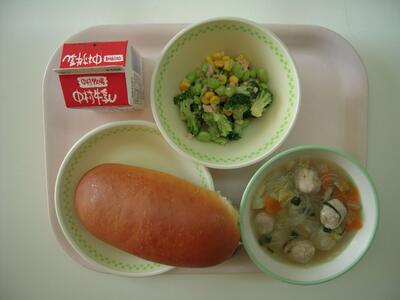今日の給食献立は、「はくさいとにくだんごのスープ」「ツナコーンサラダ」「チーズパン」「牛乳」です。