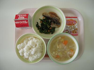 今日の給食献立は、「いももちじる」「いわしのみぞれに」「ほうれんそうのごまあえ」「せつぶんまめ」「ご飯」「牛乳」です。