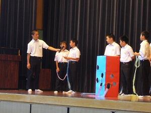 第67回体育大会の結団式が6時間目に行われました。校長先生のお話、体育大会実行委員長のあいさつの後に、スローガンが発表されました。「魂で叫べ! Do my best 君の力無限大」という素晴らしい合い言葉が誕生しました。団の色の抽選では、4ラウンドに及ぶレクレーション(ゲーム)によって、A団団長矢野文汰君が赤、B団団長日高賢史朗君が青を引き当てました。各団に分かれ、リーダー、職員の紹介やダブル優勝を目指す雄叫びをあげ、大変な盛り上がりを見せました。今年の体育大会は9月8日(日)を予定しております。どうぞお楽しみに・・・!