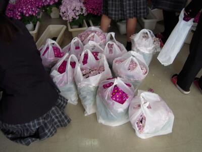 1年生は、お花を持って帰ることができるよう袋詰めしています。