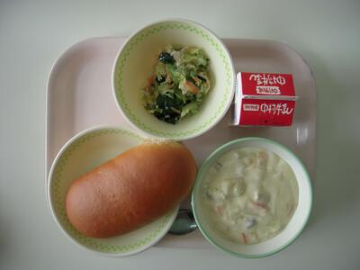 今日の給食献立は、「クリームシチュー」「こまつなサラダ」「くろパン」「牛乳」です。