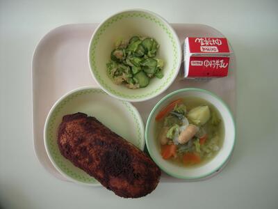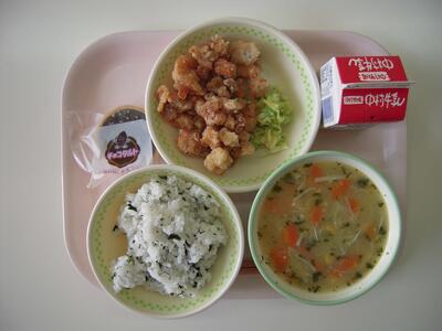今日の給食献立は、「コーンスープ」「とりにくのからあげ」「ゆでキャベツ」「チョコタルト」「わかめごはん」「牛乳」です。
