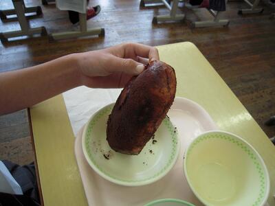 ココアあげパンは、パンの周りを砂糖味のココアがたっぷりとまぶしてあります。このまま、口にすると、口の周りが真っ黒になってしまします。どのようして食べているのか、生徒の皆さんの様子を観察してみました。