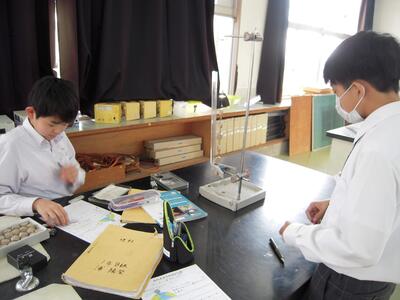 1年生がおもりを使って実験をしています。