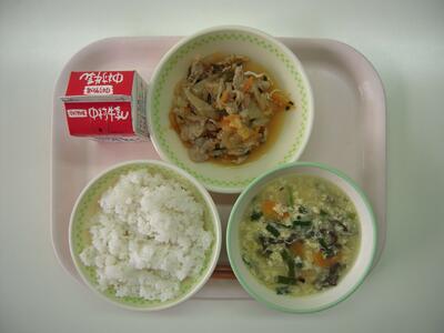 今日の給食献立は、「にらたまスープ」「キムタクごはん」「ご飯」「牛乳」です。