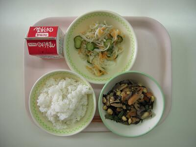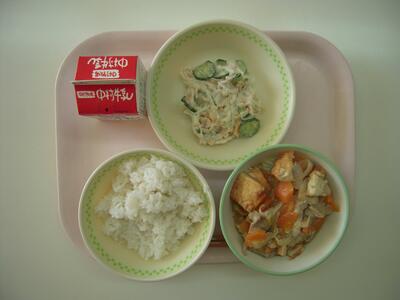 今日の給食献立は、「あつあげのちゅうかに」「なっとうサラダ」「ご飯」「牛乳」です。