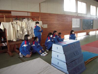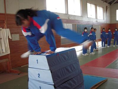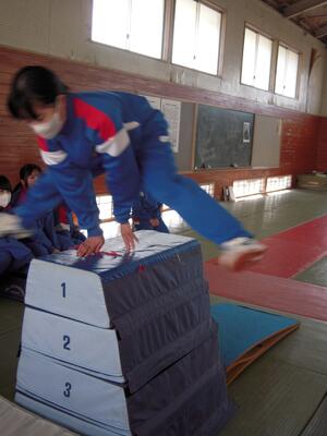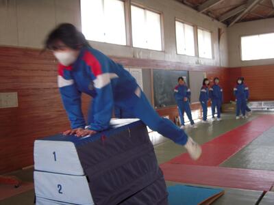 今日の授業の様子です。2年生が保健体育の授業で、跳び箱にチャレンジしています。今日は、跳び箱の実技テストが実施されています。