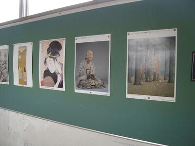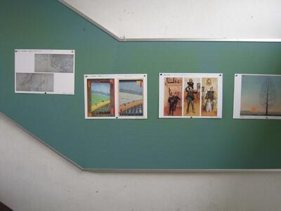 校内の掲示物は、不定期で入れ替わります。2階にあがる階段は、主に美術作品が展示されています。
