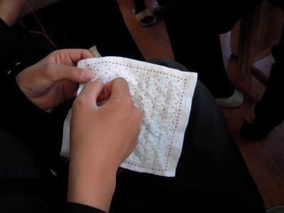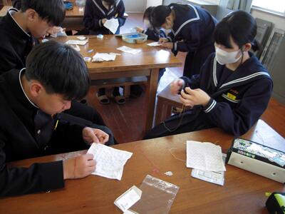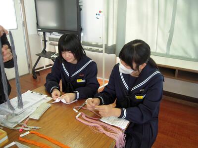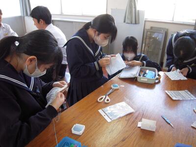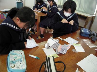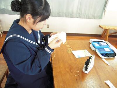 今日の授業の様子です。2年生は「刺し子」に取り組んでいます。運針にも慣れ、集中して刺し子に取り組んでいます。ある生徒に「楽しいですか?」と尋ねてみると、「先生、無心になれるので楽しいです。」