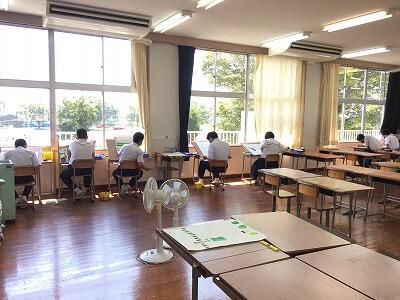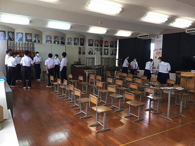 1年生です。テストが始める前に教科書等をしまっています。↓