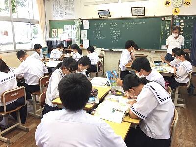 1年生の国語です。図書室でビブリオバトルの準備をしています。↓