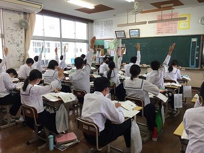 1年生の国語です。品詞名(10)を全部言えた人が手を挙げています。↓