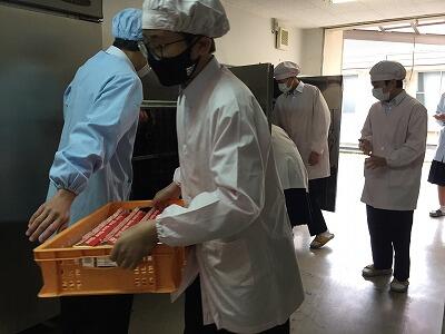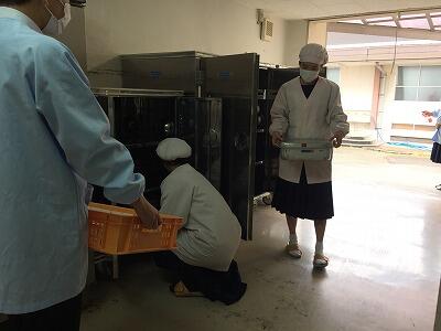 コンテナ室から、ごはん、おかず、牛乳などを運びます。↓