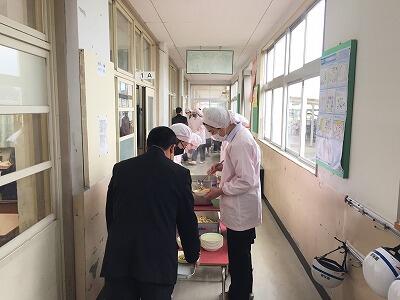 1年生は廊下でごはんやおかずをついで配膳します。↓