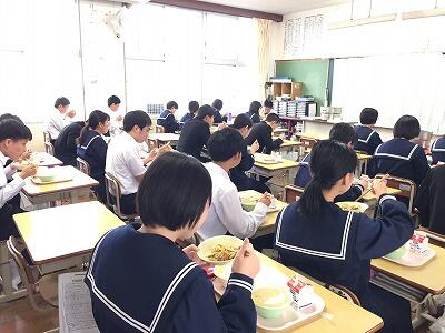 感染予防のため、グループにならず、一人ずつ前を向いてしゃべらないで食べます。↓