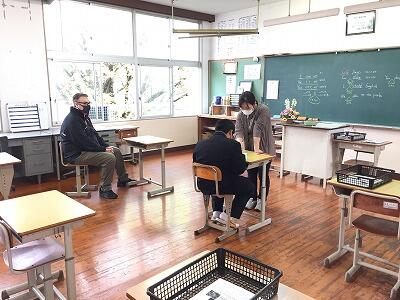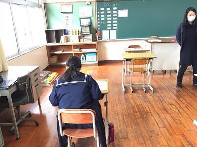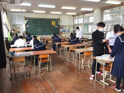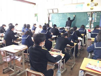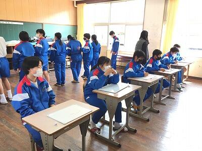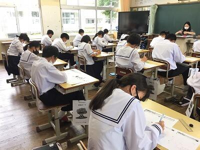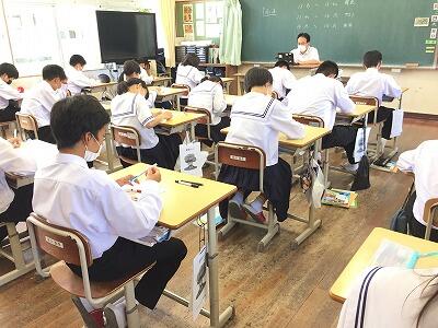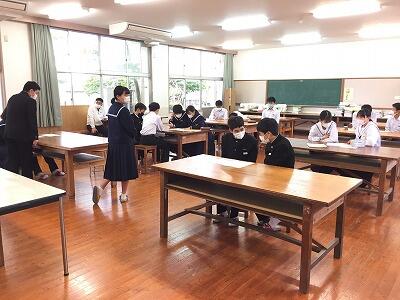 3年生の実力テストです。問題を配って説明を聞いています。↓