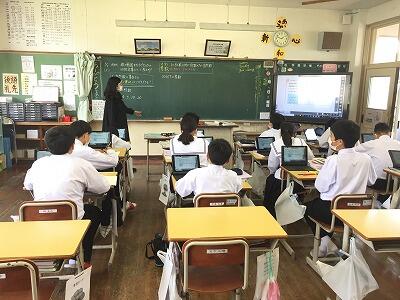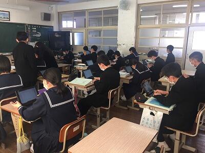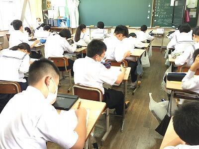 3Dの社会です。「現代社会と私たち」の単元の学習をタブレットも活用して取り組んでいます。↓