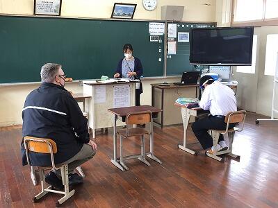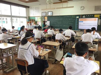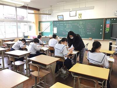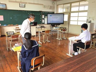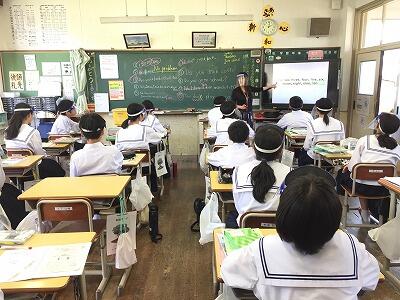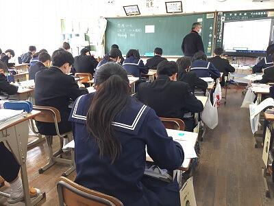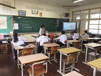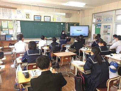 1年生の英語です。グループ活動の説明を受けています。ALTの先生も指導します。↓
