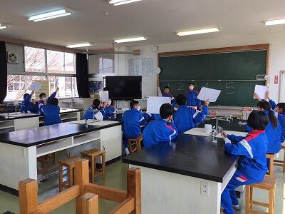 3年の理科です。入試対策の問題の解説を聞いています。↓