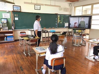 3年生の英語です。宮崎についてまとめたスライドを用いて、英語で説明しています。↓