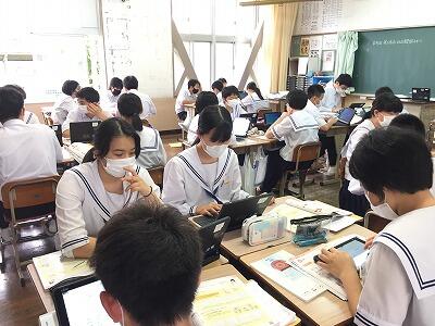 2年生は高校調べとそのまとめをタブレットを活用して行っています。↓