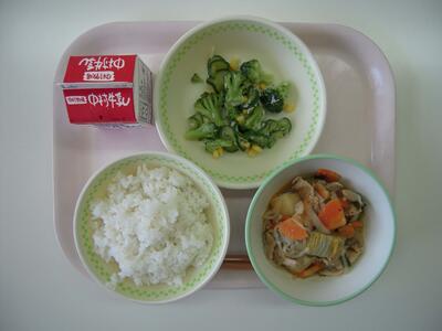 今日の給食献立は、「ぶたじゃがキムチ」「ブロッコリーのサラダ」「ご飯」「牛乳」です。