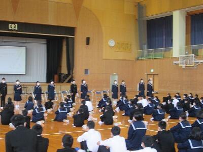 5,6校時に歓迎行事が行われ、生徒会の紹介・説明と部活動紹介がありました。新入生は生徒会の様子に大人の社会の雰囲気を感じるとともに、部活動紹介の説明やプレーに目を輝かせどの部に入ろうかと胸を躍らせているようでした。