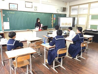 1年の数学です。少人数指導で、空間図形の学習をしています。タブレットも活用しています。↓