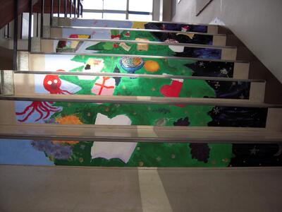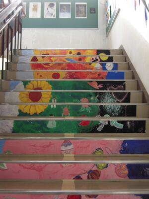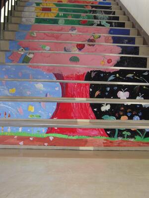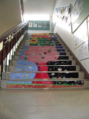 学校には、階段がつきものです。その階段の1段分の高さのこと(蹴上げ:けあげ)と言いますが、正面玄関から2階に上がる階段の蹴上げに新しい絵が掲示されました。制作者は美術部の皆さんです。シール式になっているので、絵を描いた後、はってくれました。