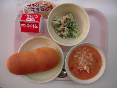 今日の給食献立は、「ABCミネストローネ」「ブロッコリーのマヨネーズあえ」「チョコクレープ」「ミルクパン」「牛乳」です。