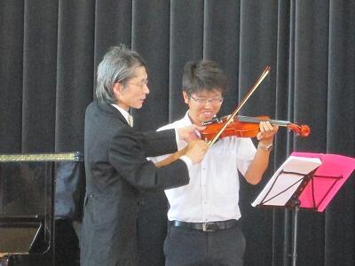 校長先生は、ヴァイオリンのデュエットに挑戦しました。