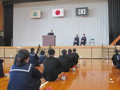 まず、新任式です。写真には3名が写っていますが、5名が新たに国光原中学校の教職員となりました。よろしくお願いいたします。