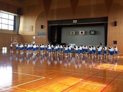 3年の学年体育です。ストレッチの練習をしています。