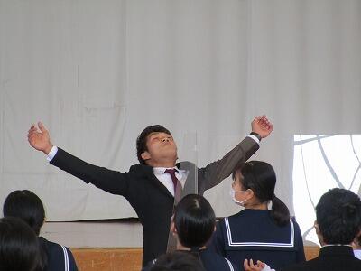 永田氏は多賀小、国中出身のプロボクサーで、昨年度スーパーライト級タイトルマッチで勝利しチャンピオンとなりました。小中高時代の生活、ボクシングを究めていく中での努力、苦労や挫折、栄誉について、また感謝することの大切さなどを話してくださいました。さらに、思い出づくりで一緒にパフォーマンスをしました。