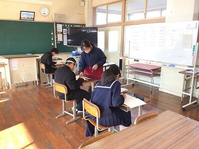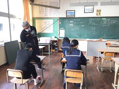 3年生です。私立高校入試で残った生徒が少ないためA級、B級一緒に学習しています。それぞれの課題に取り組みながら並行して面接の練習をしています。↓