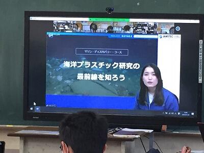 1年生はフロンティアタイムの時間にオンラインで、JAMSTEC(海洋研究開発機構)から「海洋プラスチック研究の最前線を知ろう」というテーマで環境に関する授業を行っていただきました。