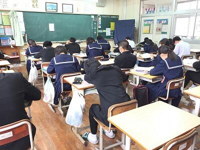 本日は通常の6時間授業(清掃なし)で、帰りの会終了15:40となります。部活動は中止です。私立高校入試があり、8名が受験します。